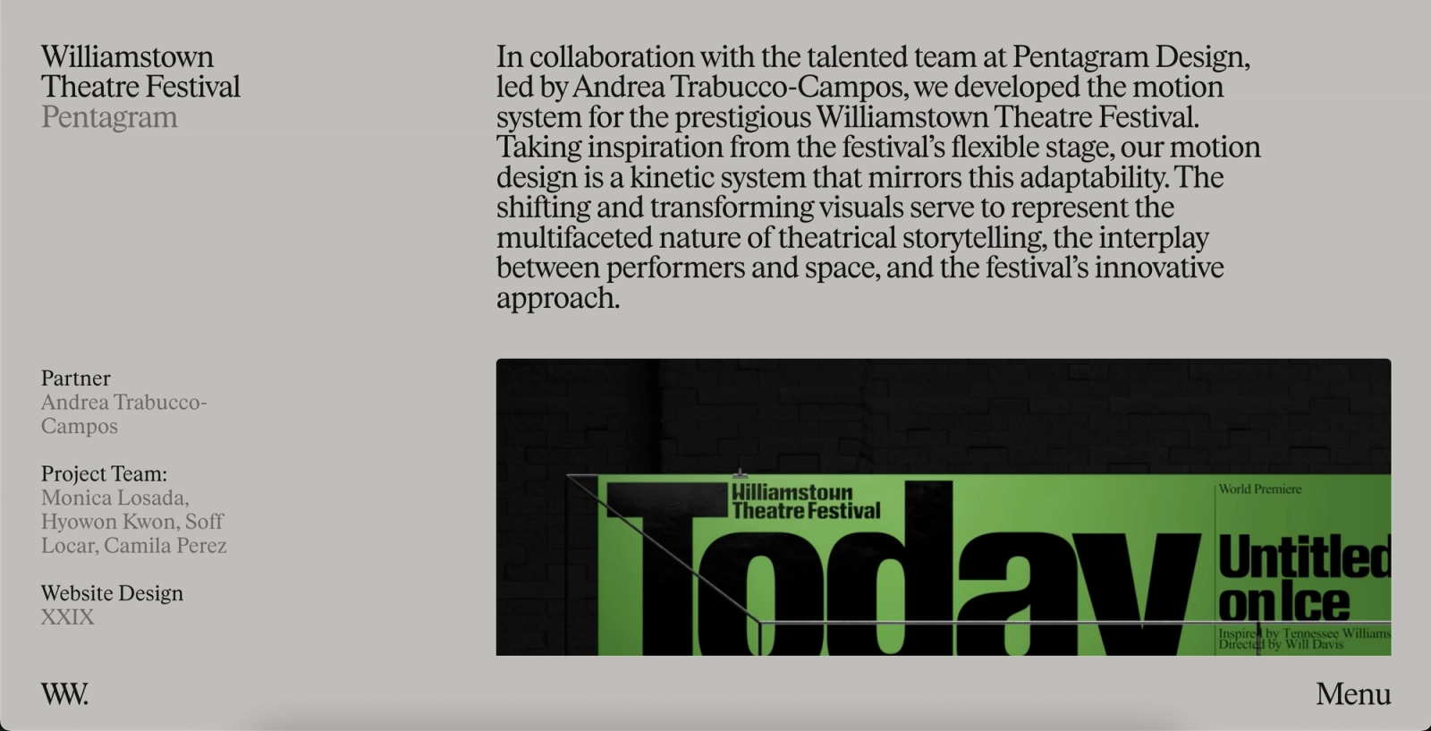 This project is still being finalized, but my involvement took place during my time at Program Studio. The development process involved numerous small iterations of trial and error, particularly regarding shaders and component animations. Indeed, the main challenge was for this portfolio to showcase motion design work, so the site needed to remain subtle and not be overloaded with effects and animations.